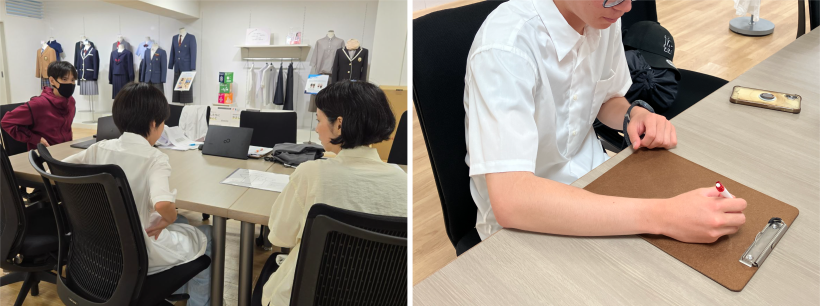 シャツを着用していただき、腕を曲げたり勉強するような姿勢をとってもらったりしながら、上記にあげた2つのポイントについてヒアリングしました。