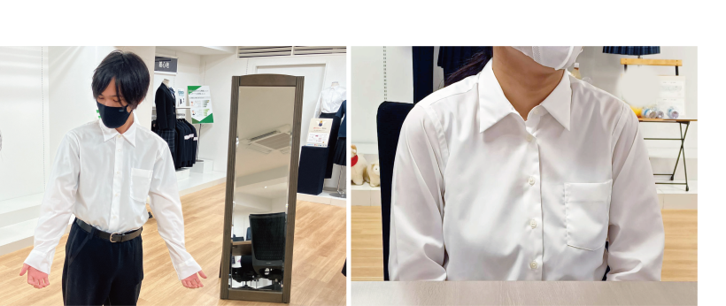 まずは当事者の方からいただいたご意見を取り入れながら、一番肌に近いワイシャツの長袖を開発してきました。開発の際には当事者の方に着用いただく試着会を開催し、気になる点はないか、ポイントごとにお尋ねしています。これまでに2回開催し、共同研究者であり、ご本人も当事者である加藤さんや、普段から制服に困りごとがある中高生の方々に着用してもらい意見をいただいてきました。