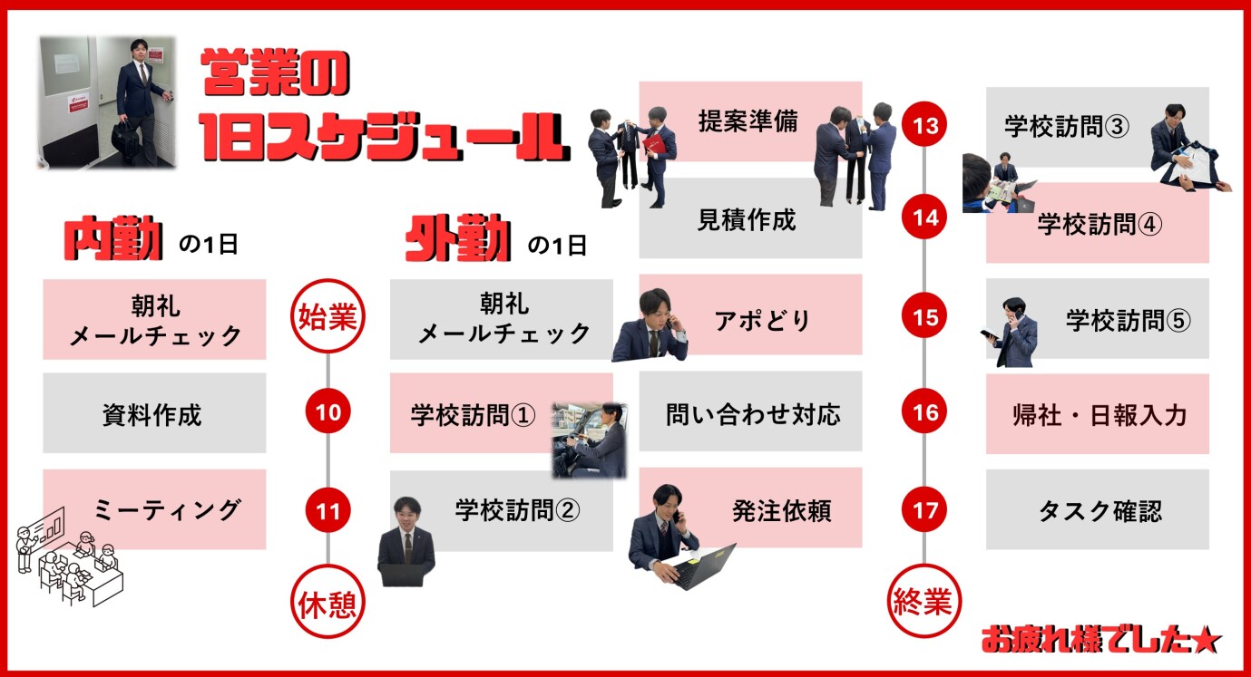 学生服業界の場合、12月~4月ごろが繁忙期です。繁忙期では、店頭や学校での採寸業務も多くなります。 効率よく内勤し、できるだけ外に出て、多くの方々と接する機会を増やすことが重要です。